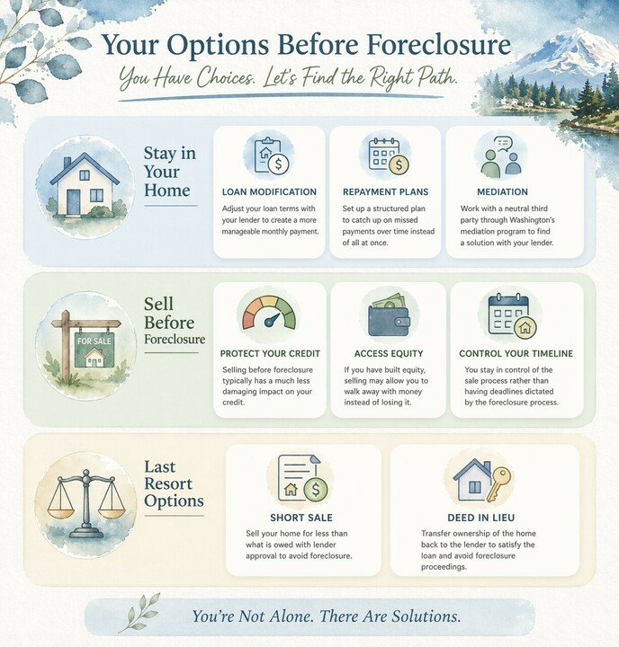 If you’re facing pre-foreclosure, it’s important to know that you still have options and more control than you may think. Many homeowners in Pierce County are able to work out solutions with their lender, sell before foreclosure, or explore alternative paths that protect their financial future. Take a moment to review the linked options outlined below so you can better understand what may work best for your situation. If you would like guidance tailored to your specific circumstances, We are here to help! Feel free to call or text us for a private, no-pressure conversation about your next steps.